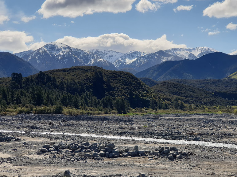 The trail winds its way in and out of the forest, sometimes coming onto the braided river bed. As the mountains draw closer the trail uses more of the gravel forestry roads to make its way up the Kowhai valley. The roads weren’t very well signposted but we were periodically able to get signal so we could check our directions.