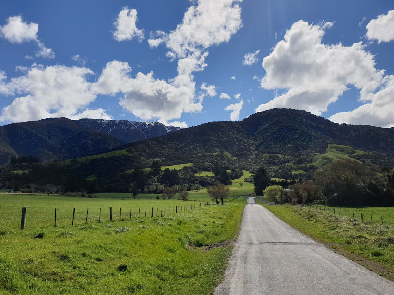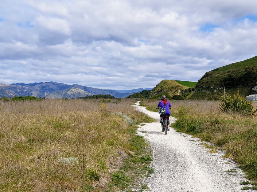 The trail is easy enough to follow at the start leading towards the south you travel and a well looked after path along the dunes, then through some pine forests. The trail keeps you off the main road and a few kilometers from town you travel under the bridge then follow along the left side of the ‘Kaikoura Golf Club’. Here you have the choice of following the gravel road along the Kowhai river, or left along a meandering and sometimes tight mountain bike trail. We chose to go along the mountain bike trail, this was a fun and winding way to travel up along the river.